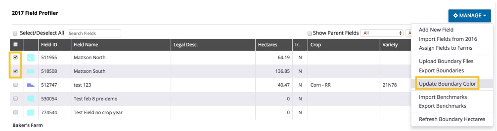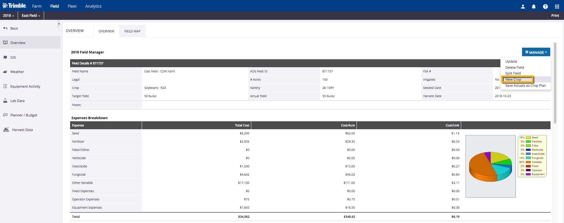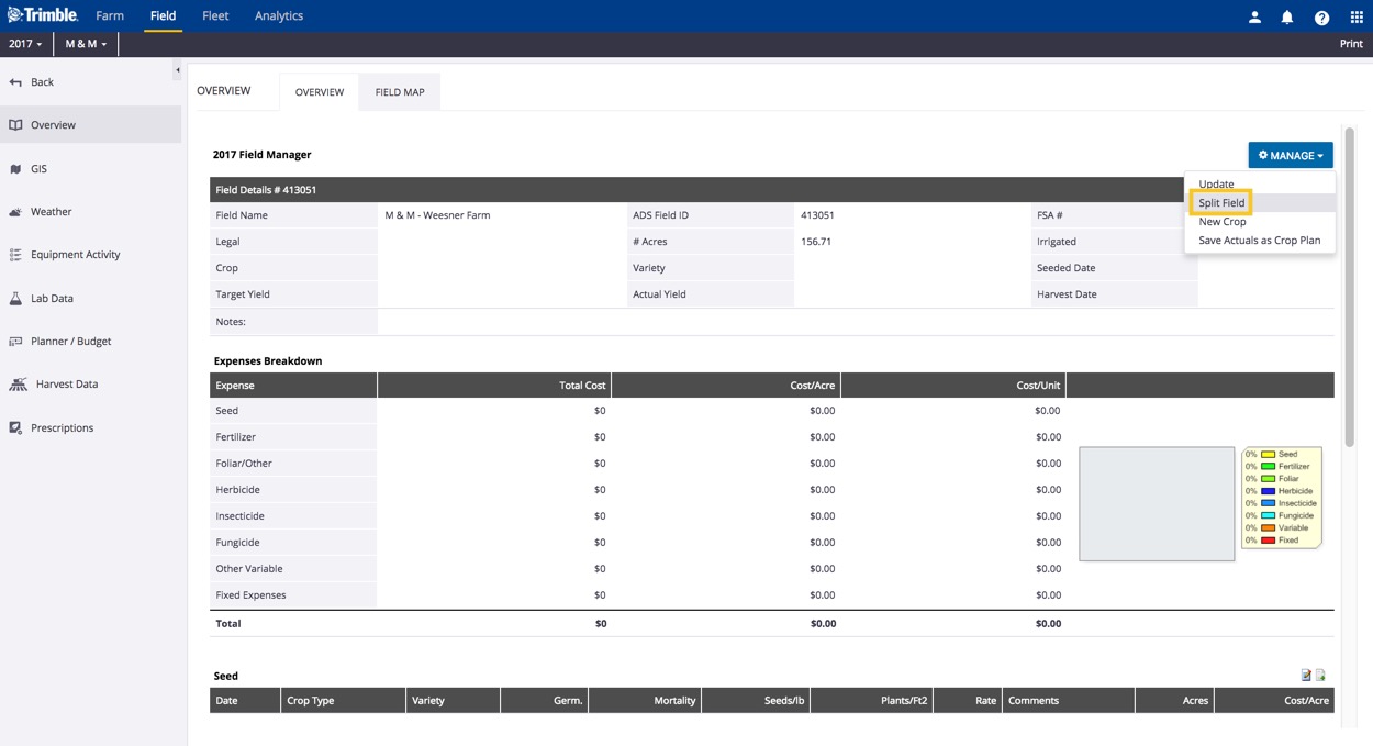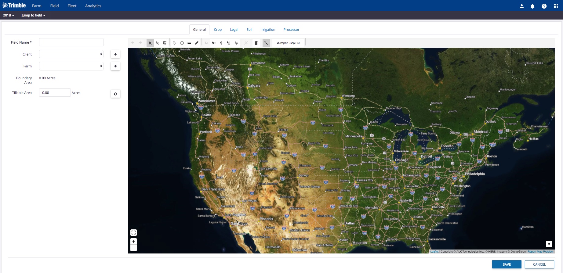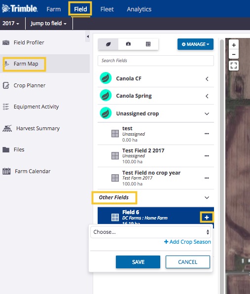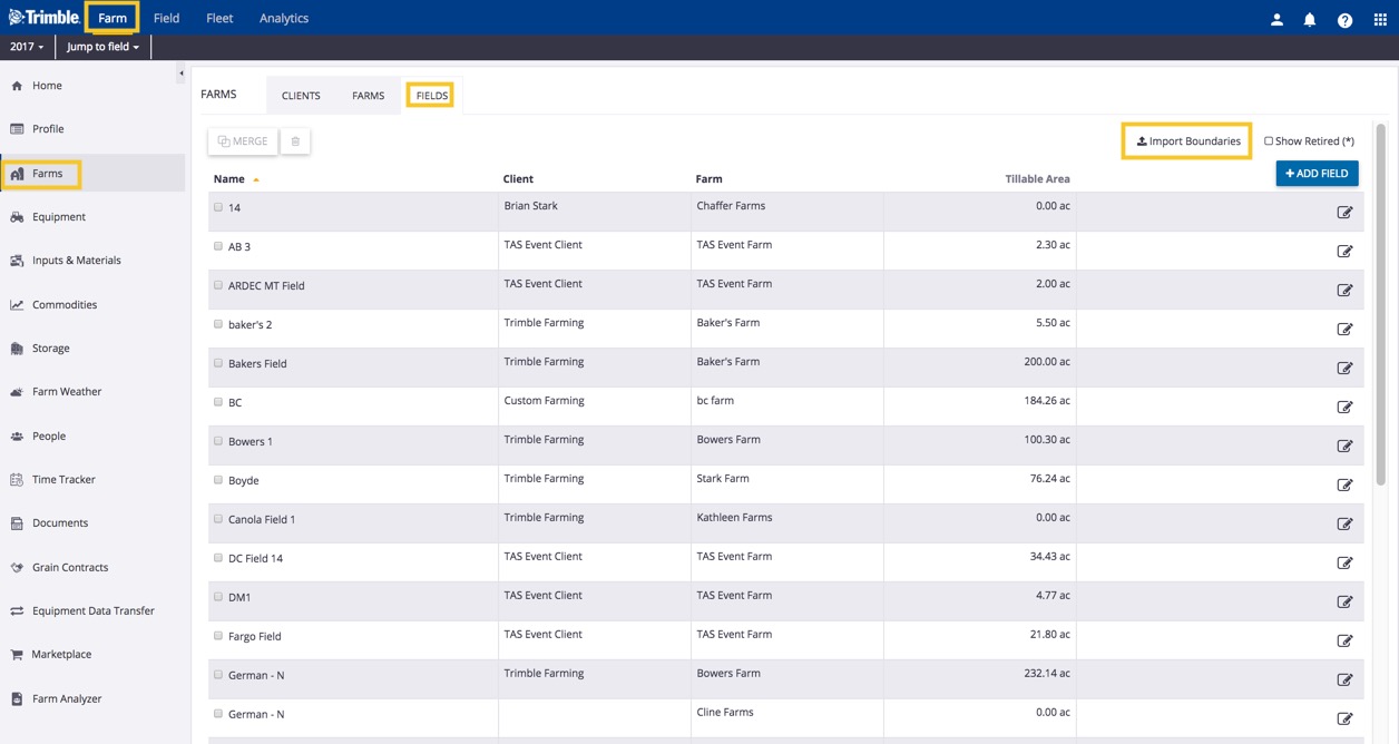 Keep track of fields across your Trimble Ag Software account, with or without a fixed crop year. Fields can be added, merged or retired as your business needs change. Manage field details, draw and import boundaries, transfer fields between crop years and more.