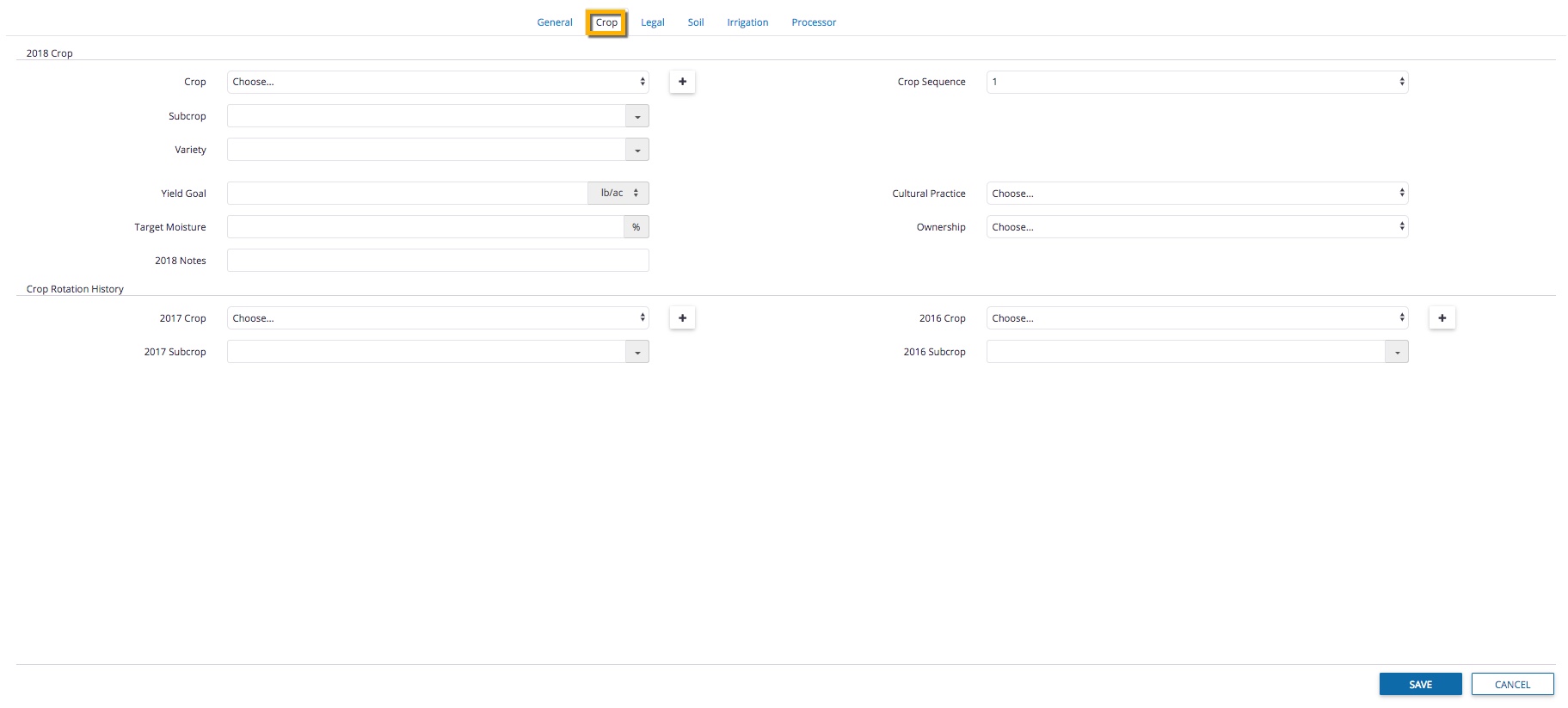 Add fields to your online account with as much or as little information as you need, with the option to draw or import boundaries to auto-calculate area for boundaries. Start by selecting the preferred crop year, then enter details on each tab before saving all changes at once. Return to this field profile editor any time by jumping to a field or selecting the field name from the Field Profiler list, then click Manage and select Update.
