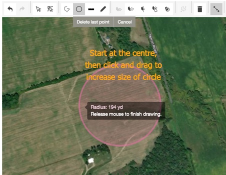 Circle boundaries for centre-pivot irrigation – start by clicking on the center of the field, click and drag in any direction to increase the circle radius, then release to close the shape