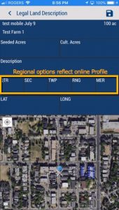 Land system references – tap to enter any legal land coordinates (note: regional options are displayed based on the Province or State and Country selected in your account Profile online)