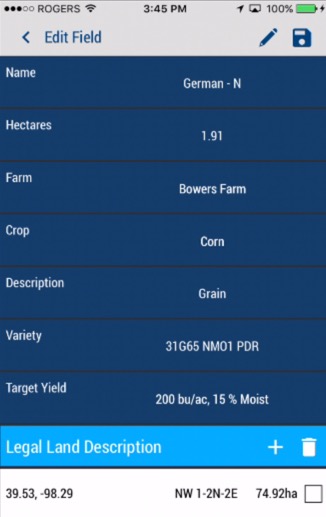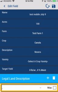 Seeded Acres (also known as Tillable Area) – tap to enter the number (may be shown as hectares, depending on your settings) to show the seeded/tillable area as different from the boundary area (for example, when a field has less planting space due to ongoing issues such as flooding, etc.)