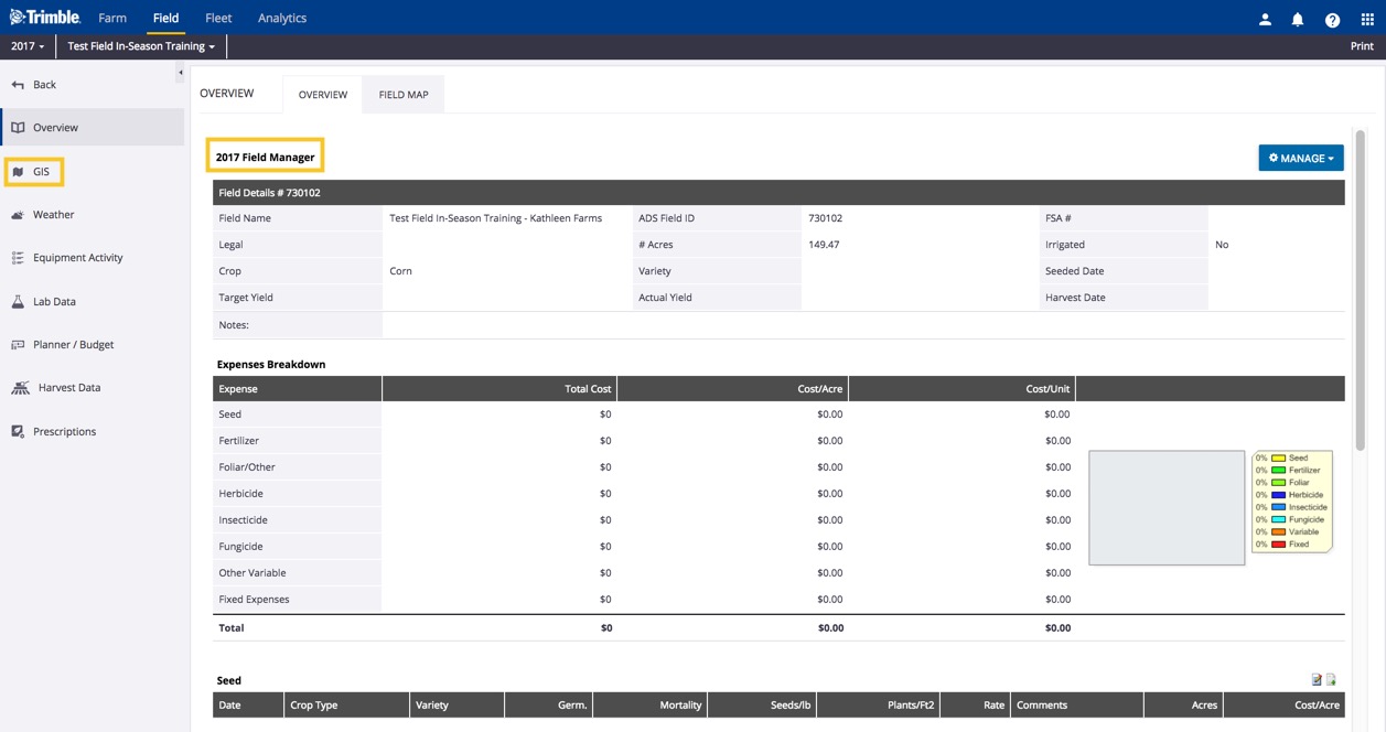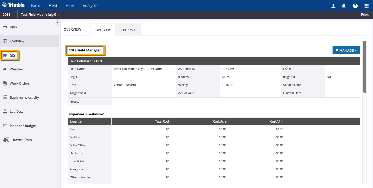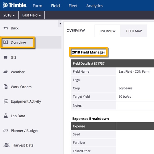 From the left navigation menu, select Overview to return to the Field Manager (actuals) screen
