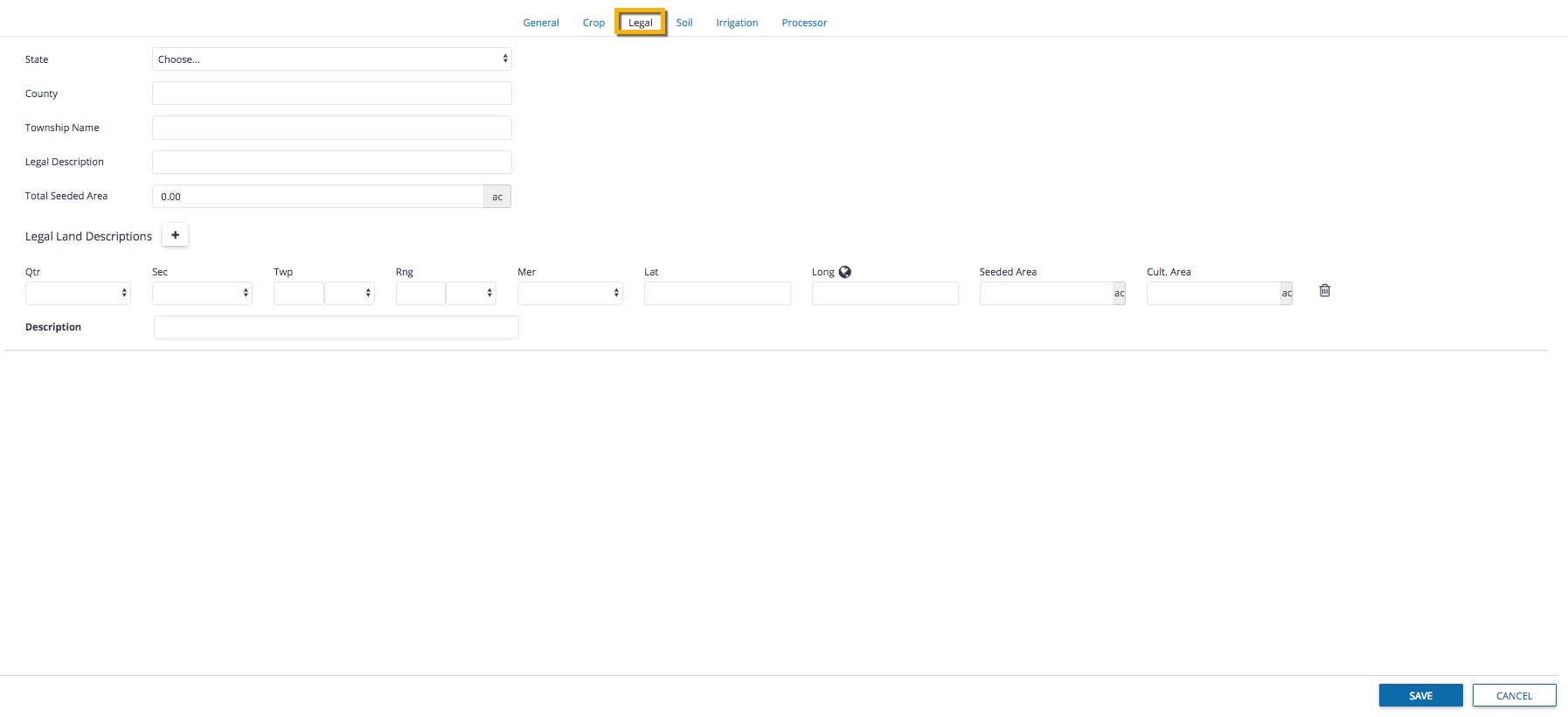Use the Legal tab to record the legal land description and latitude/longitude coordinates (visible to North American customers only based on the Country selected in your account Profile online)