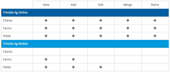 Once farm assets are set up online in your Trimble Ag Software account, including clients, farms and fields, you can view and make certain changes to these records on the mobile app.