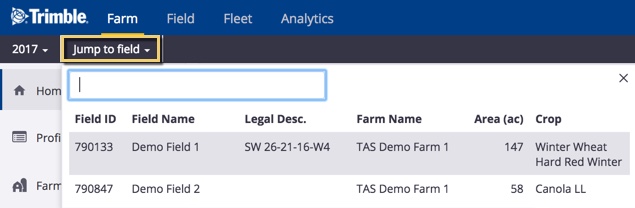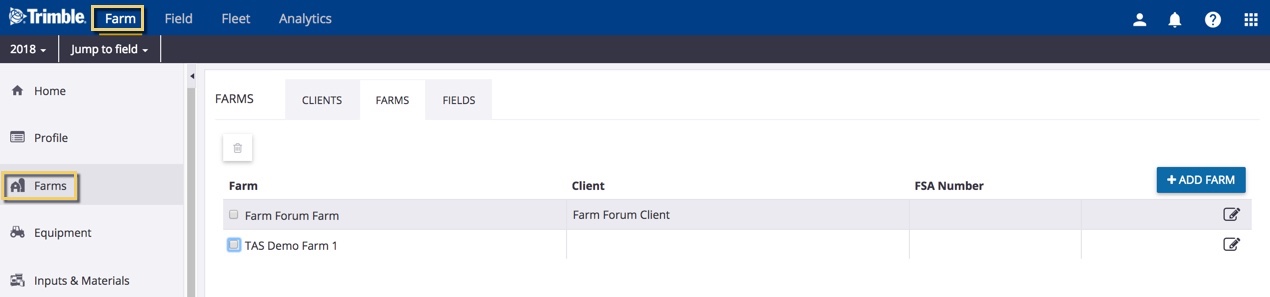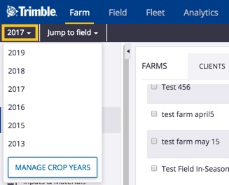 Note: client and farm names are associated with each other in Trimble Ag Software to line up with most vehicle displays; if you’re not seeing a farm name in the dropdown list, check that the related client has been added to that farm under Farms on the Farm tab (learn more)