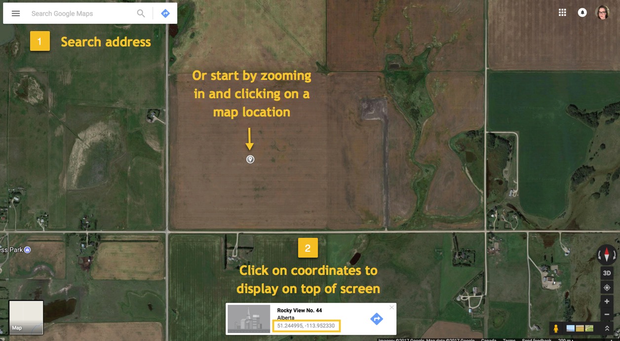 Zoom in to the preferred location on the satellite map using the plus + and minus– icons (bottom right), or click and drag to move the map in any direction