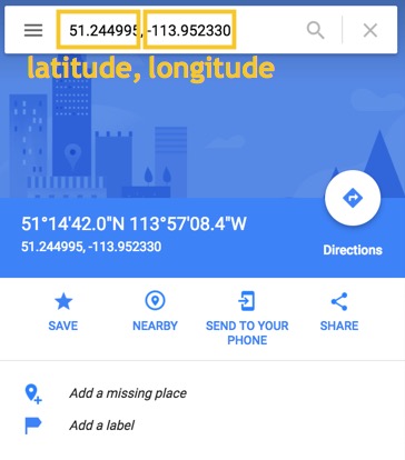 LAT and LONG – automatically update the latitude and longitude coordinates by moving the map under the white X, or tap the white compass icon on the top left corner of the map to move to show your current location