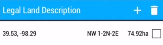 Tap to edit the Legal Land Description (a series of numbers listed on land title records, representing section, township, range and meridian), or tap the checkbox to select and delete the entry, then tap the + icon to add a new entry