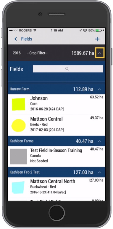 Tap the arrow on the black row to expand the farms list, then scroll and tap to select a field