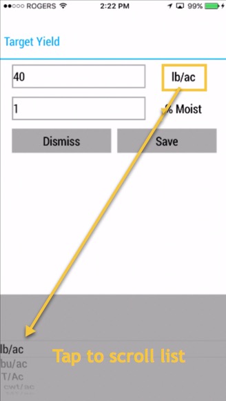 Tap Target Yield to edit the quantity per area, tapping on the unit of measure shown to scroll and select a different measurement from the list, edit the moisture percentage, then click Save (or Dismiss)