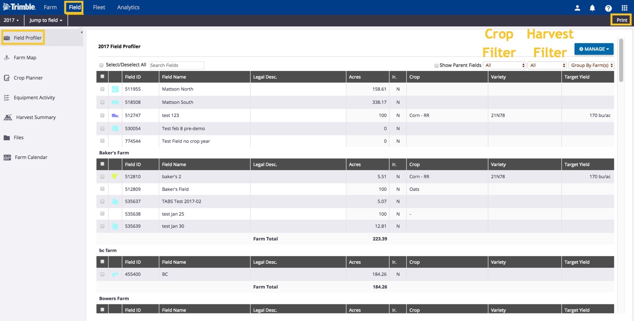 In addition to managing field boundaries, use the Field Profiler™ to assign fields to farms on your Trimble Ag Software Account. Save time by organizing farm resources with the click of a button.