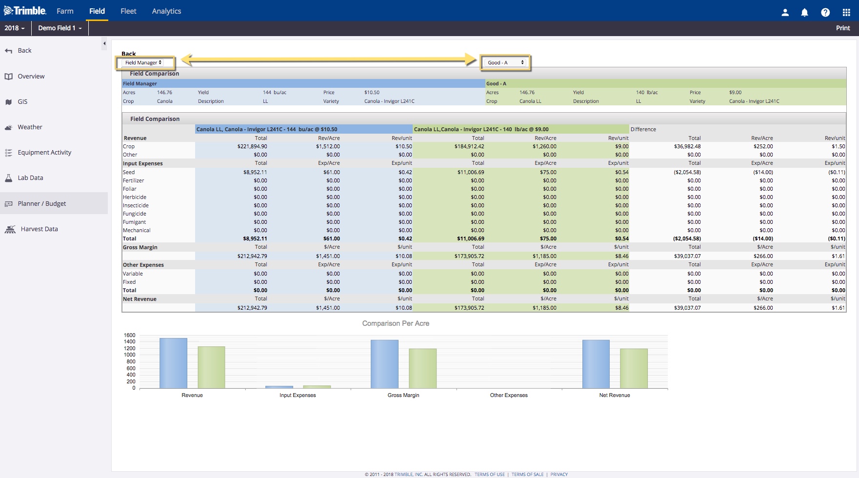 Select any two plans or actuals from the lists at the top of the screen to view or print the Field Comparison report to see the total cost of operating between actuals (in our example, the Field Manager actuals are on left, and the new scenario, Good – A plan, is on the right)