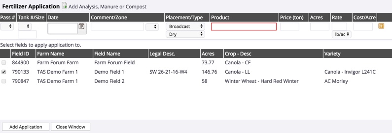 Fertilizer Application – click the add record icon to add any any planned fertilizer applications, then select one or more fields and click Add Application (or Close Window)
