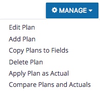 To begin working with your preferred plan as the plan of record, click Manage and select Apply Plan as Actual (replaces existing Field Manager plan of record, including any actual applications or expenses already recorded for the crop year)