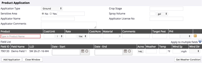 Product Application – click the add record icon to add any any planned applications, then select one or more fields and click Add Application (or Close Window); once a plan is converted to actual, this is where you can view or edit tasks read-in from vehicle displays or third-party accounts in the Field Manager Overview tab