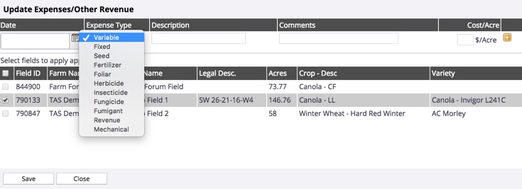 Other Expenses – click the add record icon to add any any other expense types (such as tractor repairs or lease costs), then select one or more fields and click Save (or Close)