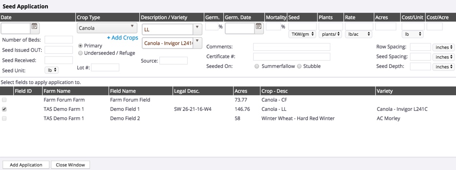 Seed – click the add record icon to display or edit the default crop type costs for any planned seed applications, then select one or more fields and click Add Application (or Close Window)