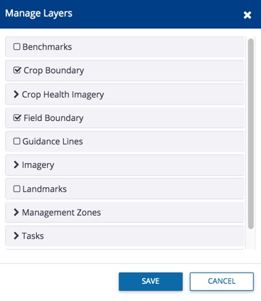 Manage Layers – click the gear icon to display the Manage Layers pop-up window, then click an arrow to expand/collapse categories, and check one or more categories then click Save (or Cancel)