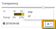 Click the Export button (bottom right corner of map) to download a single selected date layer in SHP (Shapefile) or KML (Keyhole Markup) format.
