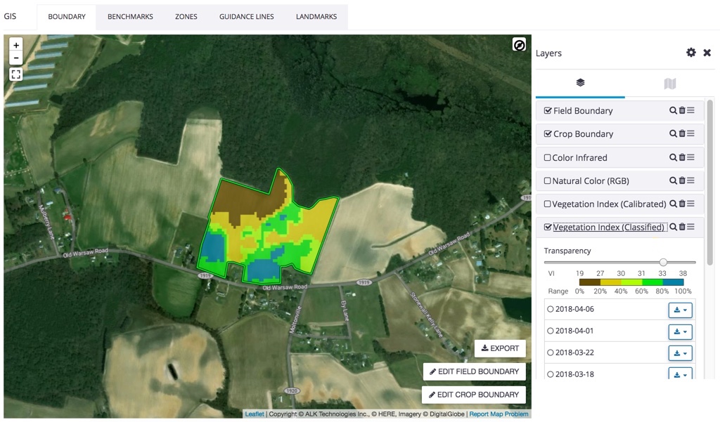 Crop Health Imagery– in-season imagery to identify areas of stronger and weaker productivity, available in four indeces: